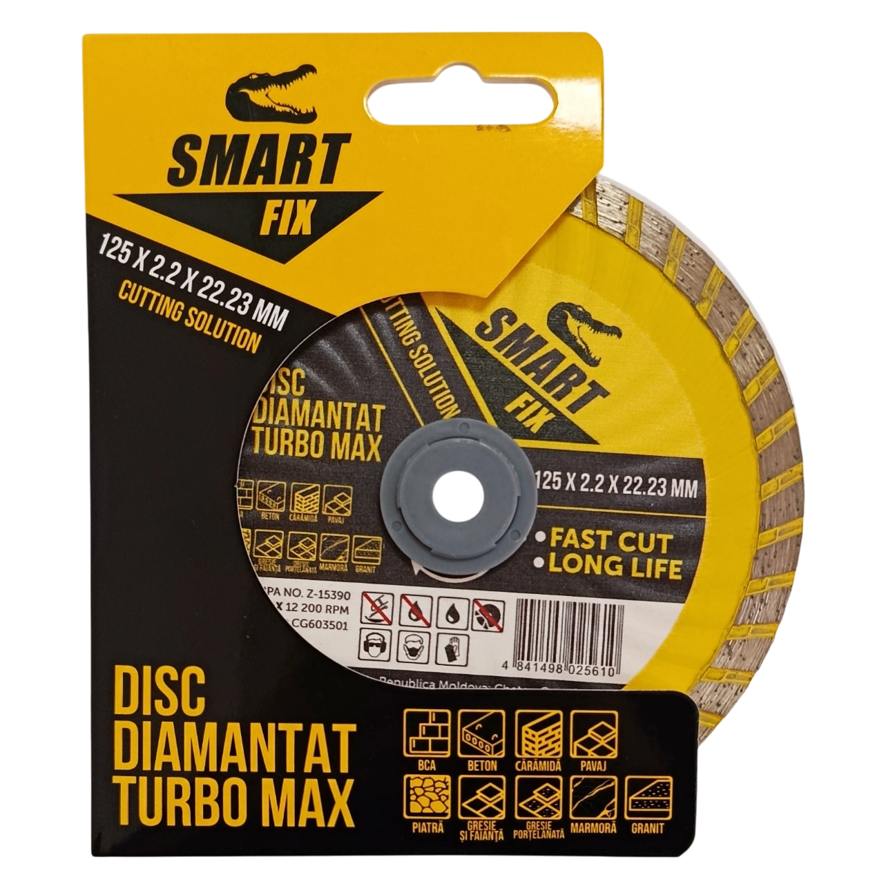 Диск демонстрирует высокую износостойкость и долгий срок службы, что делает его идеальным выбором для профессиональных строителей и мастеров, работающих с твердыми и плотными материалами. Turbo Max Smart Fix гарантирует эффективную работу, минимальный нагрев и стабильное качество реза при каждом использовании.