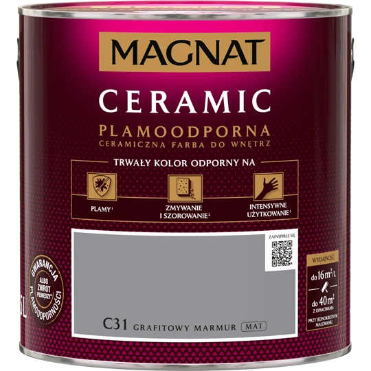 Краска моящаяся акриловая Magnat Ceramic устойчива к сложным пятнам, таким как кетчуп, горчица, кофе, чай и водорастворимые маркеры. Ее уникальная формула, включающая керамические компоненты, смолы и высококачественные пигменты, обеспечивает отличную стойкость к пятнам и долговечность. Эта инновационная технология придает покрытию исключительные свойства, идеально подходящие для внутренних помещений, где важны чистота и долговечность.